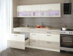 18 mm -es laminált faforgácslap, 0,4 mm - es ABS-el élzárva, süllyesztett fejű forgácslapcsavarral összeszerelve. A hátfal 3 mm-es fehér HDF lemez, tűzőkapoccsal rögzítve. A sor mindkét végén oldaltakaró található. A felnyílós felső elemek 29 cm mélyek, gázteleszkópos felnyíló vasalattal szereltek. Az alsó elemek 50,5 cm mélyek, műanyag állítható lábakkal, és egybe lábelővel vannak gyártva. A fiókok 50 cm mélyek fehér kávával és teljes kihúzású fiókcsúszóval szereltek. A felső nagy fiókhoz evőeszköztartót adunk.  A mosogatós elem szelektív kukával beépített. 38 mm-es, ABS-el élzárt munkalappal, 1 mélytálas csepegtetős mosogatótálcával.