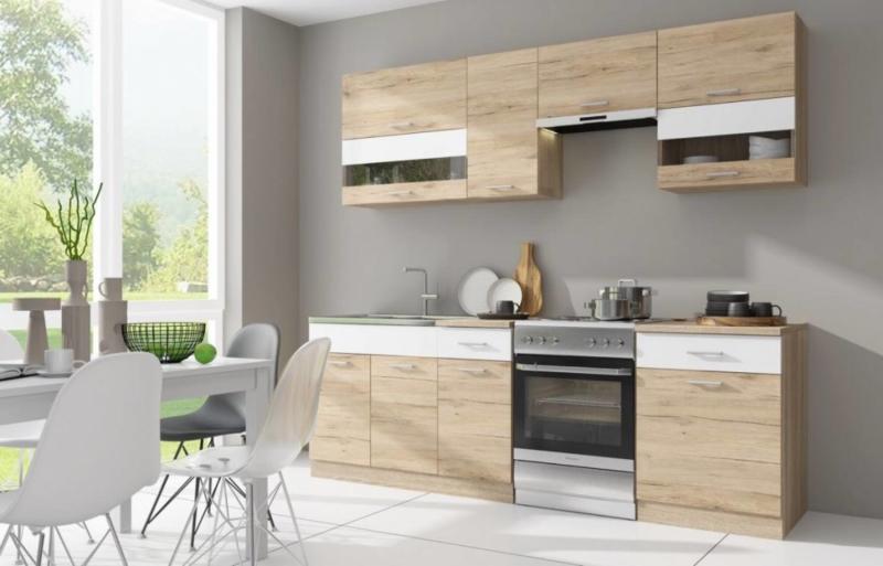 RIO konyhabútor 180 cm-es Sam remo tölgy fehér   180 cm széles modern konyhabútor, amely tökéletesen illeszkedik bármilyen konyhába. ( Az ár nem tartalmazza a mosogatótálcát, a gépeket, kiegészítőket és dekorációs elemeket. )  Szín: San remo tölgy/fehér  Mérete k (Sz x Ma x Mé): Felső elemek 1 db Felső 80-as kétajtós elem: 80 x 71,6 x 28 cm1 db Felső 60-as elem: 60 x 71,6 x 28 cm1 db Felső 60-as felnyílós elem: 60 x 35,8 x 28 cm1 db Felső 40-es elem: 40 x 71,6 x 28 cm Alsó elemek 1 db Alsó 60-as ajtós, fiókos elem: 60 x 82 x 48 cm (60 cm-es munkalappal)1 db Alsó 40-es ajtós, fiókos elem: 40 x 82 x 48 cm (40 cm-es munkalappal)1 db Alsó 80-as mosogatós elem: 80 x 82 x 48 cm Tulajdonságok: - MDF frontok- Gázemelős mechanikaA terméket lapra szerelten, csomagolva szállítjuk.   Szállítási feltételek, díjak:   Minden esetben változó, kedvező áron az ország egész területére megrendelheted ezt a szolgáltatást. A szállítási díj a vásárolt termék értékétől illetve a lakóhelyed távolságától függ. Természetesen mindenben amire szükséged van, a rendelkezésedre állunk, de a szállítás nem tartalmazza a házba/emeletre való pakolás költségét. Kérjük a szállítás részleteinek rögzítésekor mindenképp jelezd ha pakolást is igényelsz, mert alap esetben kollégánk egyedül érkezik a helyszínre és nem áll módjában a bútort be/fel pakolni. Igény esetén 2 munkatárs érkezik és sérülésmentesen a helyszínre teszik a bútort.  - Mindigbútor